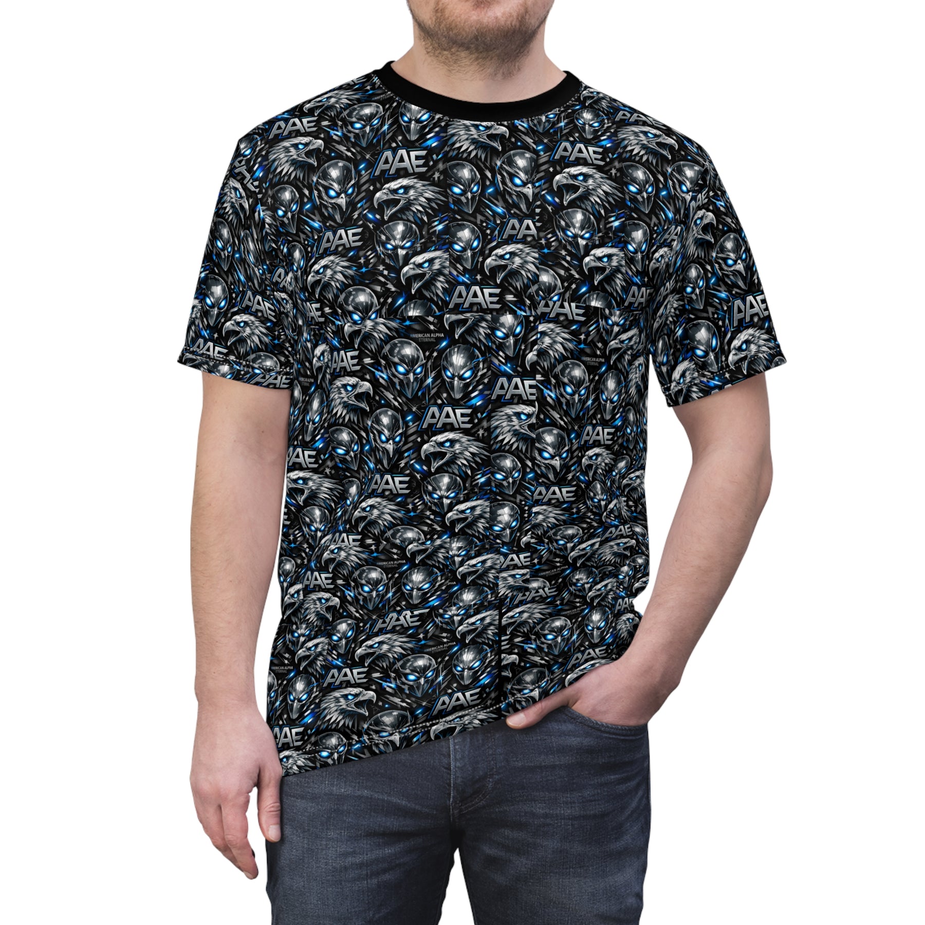 This all-over printed tee brings a bold, urban edge to everyday wear. Dense, repeating alien-and- eagle artwork in deep blacks and blue highlights creates a moody, immersive pattern that reads like street-art armor from a distance and rewards a closer look with layered detail. The regular fit and tagless finish keep the silhouette clean while the ribbed collar and shoulder tape add structure for long-term wear. Wear it under a leather jacket for late-night shows, layer it with a flannel for gritty weekend hangs, or let it stand alone as the statement piece for nights out—this tee slides into the wardrobe of someone who favors attitude and texture over quiet basics.