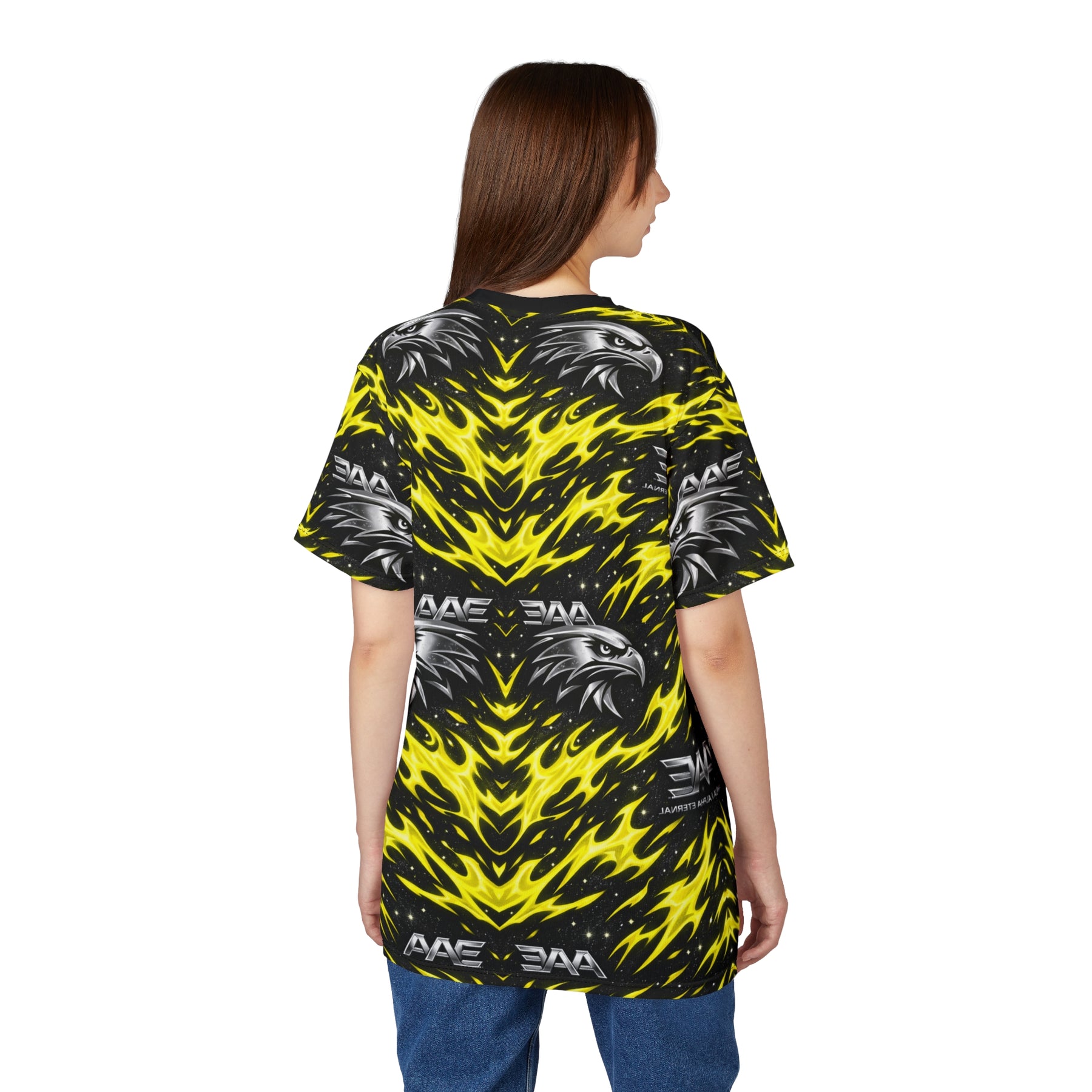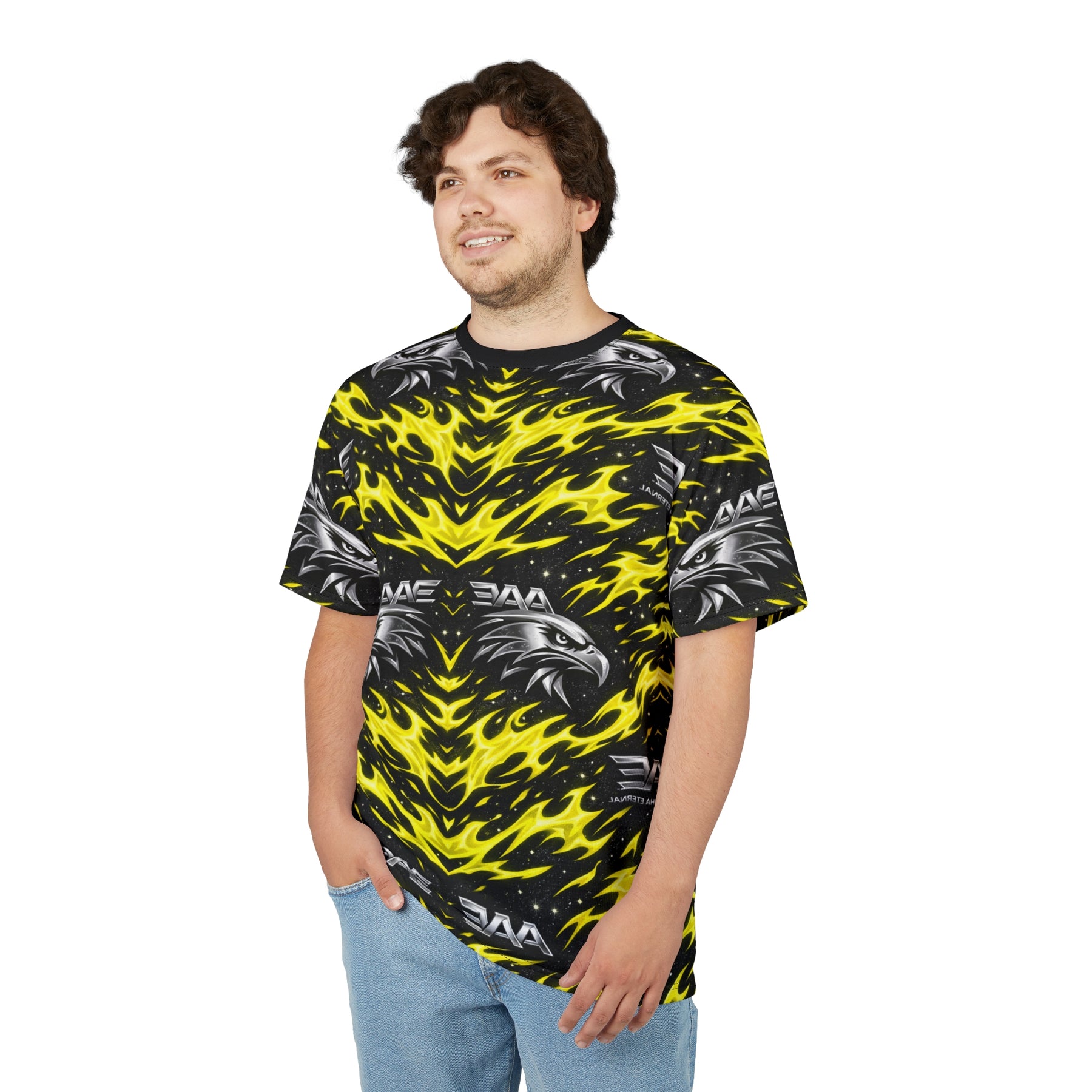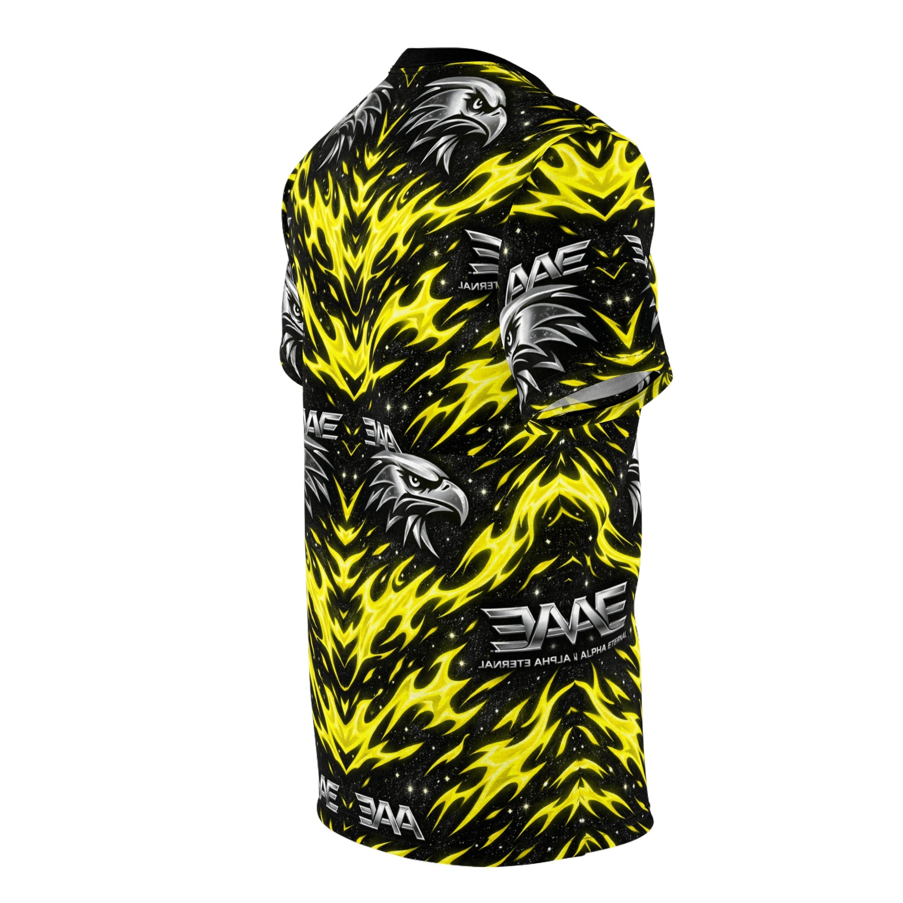 This tee carries the heat of a street-ready emblem — bold, sunlit flame art that reads like a rally cry. It sits light on the skin and keeps its shape, so you can move through the block, a session, or an all-night set without the shirt losing its edge. The yellow flame motif feels alive against the fabric: warm, loud, and unapologetic. Wear it with worn denim and a low-top, or layer under a lightweight jacket when the night cools. It’s made to stand out in urban rhythms and late sunsets, a piece that adds pulse to a laid-back rotation and keeps its structure wash after wash.