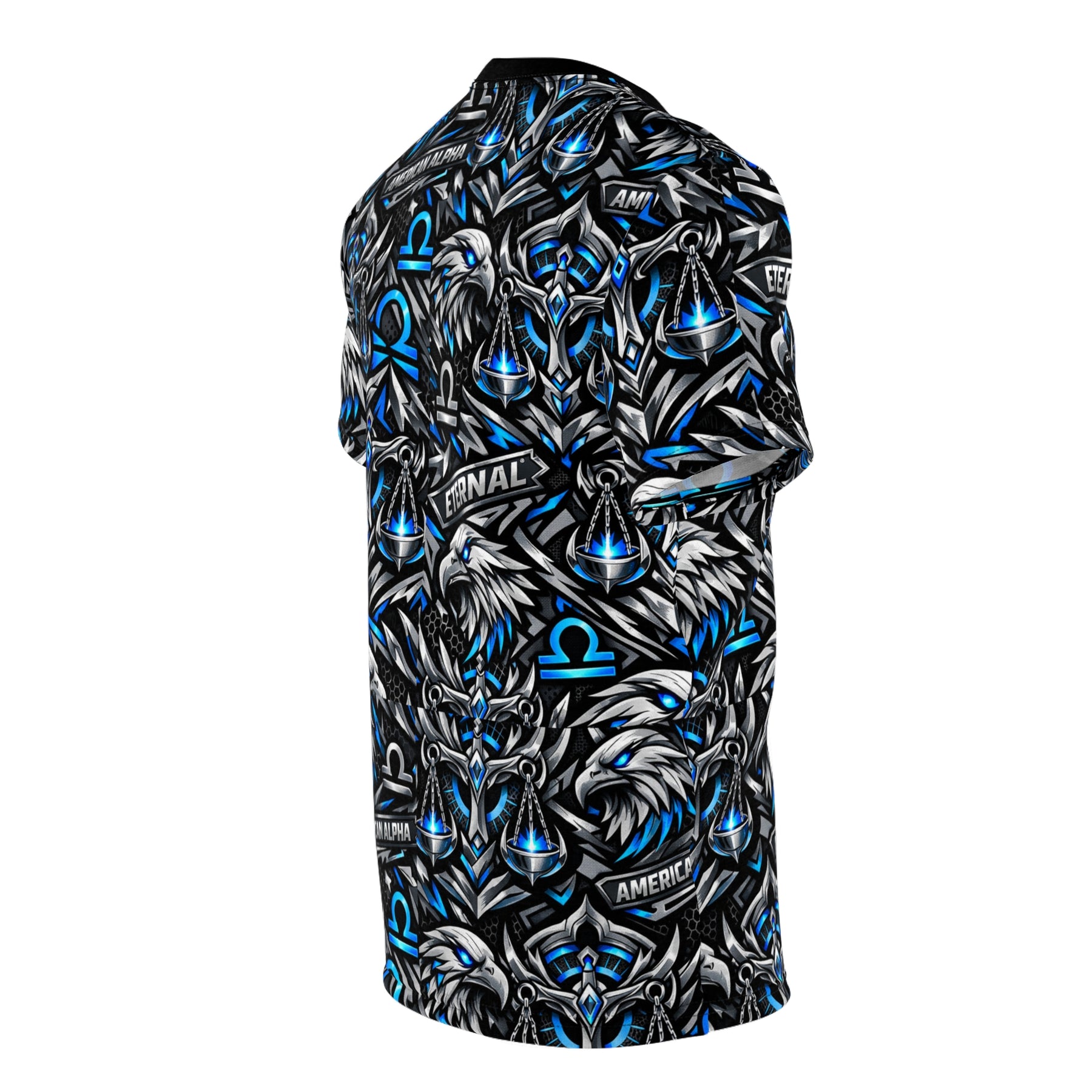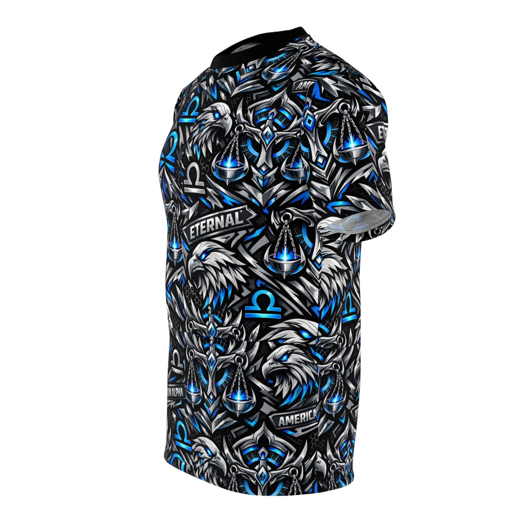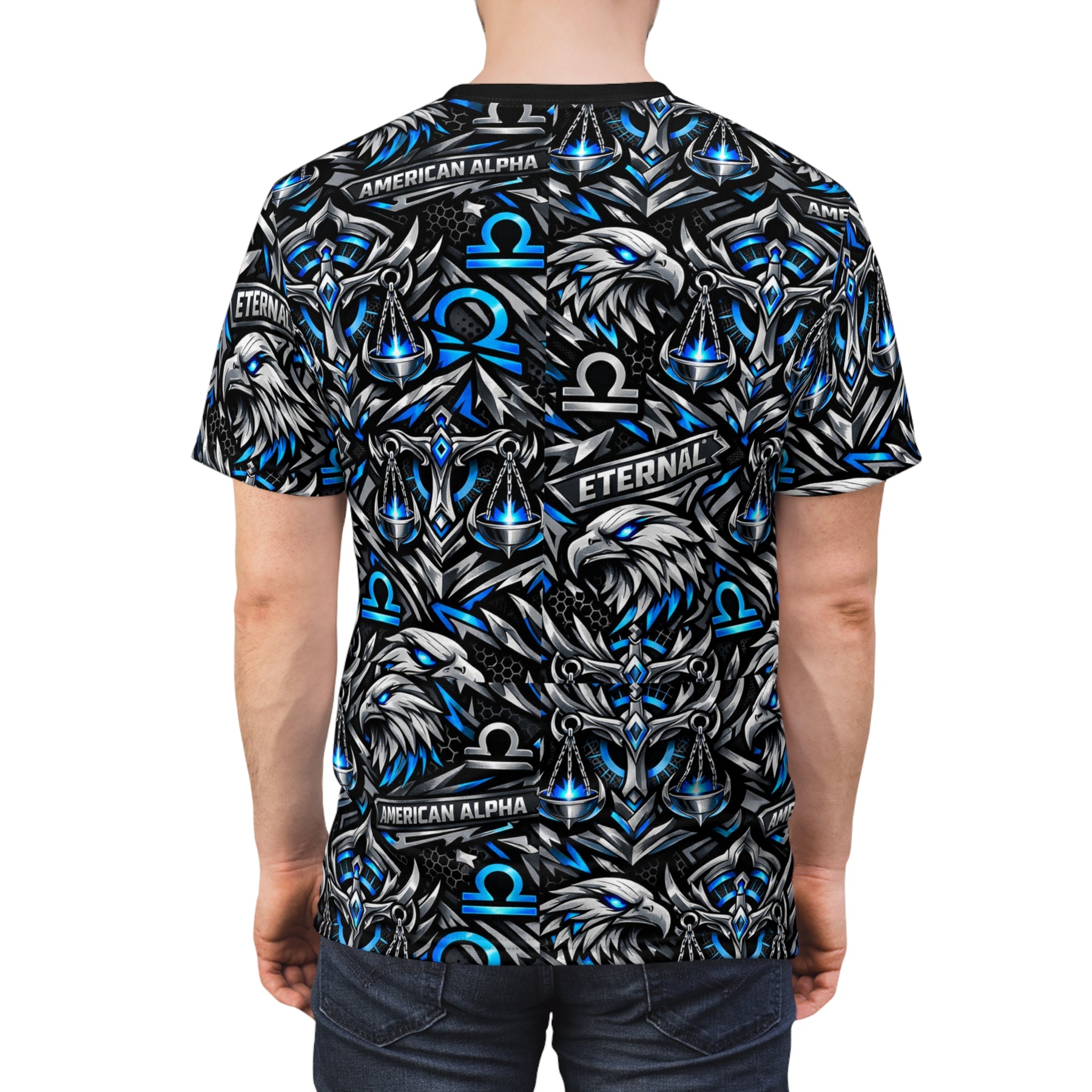 This Libra American Alpha Eternal Street Wear all-over print tee channels raw energy and bold astrology symbolism — a layered collage of fierce eagles, electric blue Libra omega symbols, and subtle banners reading “AMERICAN ALPHA” and “ETERNAL.” Lightweight yet structured, the fabric holds vivid, high-contrast color so the design stays sharp wash after wash. Wear it to stand out at meetups, gaming nights, or street runs; it reads like a personal emblem for someone who values strength, legacy, and edge. The regular fit and tagless construction keep focus on the art while the ribbed collar and shoulder tape give a reliable, lived-in feel. It’s a statement piece that sits naturally in wardrobes that favor athletic, team, or clan-inspired aesthetics.