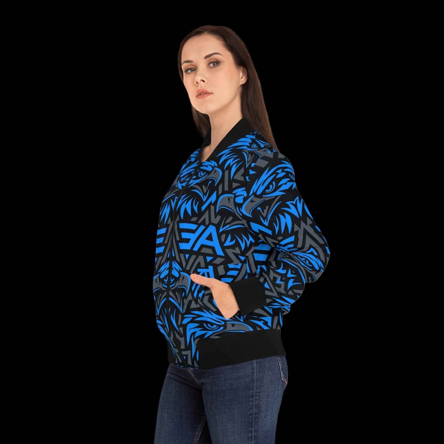This bomber jacket brings bold street energy and team spirit together. A repeating eagle motif and stylized AAE monogram are rendered in electric blue and charcoal, wrapping the jacket in a striking, modern pattern. The fitted stand collar and ribbed cuffs give it a classic silhouette while the all-over print keeps the look loud and confident. Slide it on for game days, practice sessions, or when you want your outer layer to speak before you do.