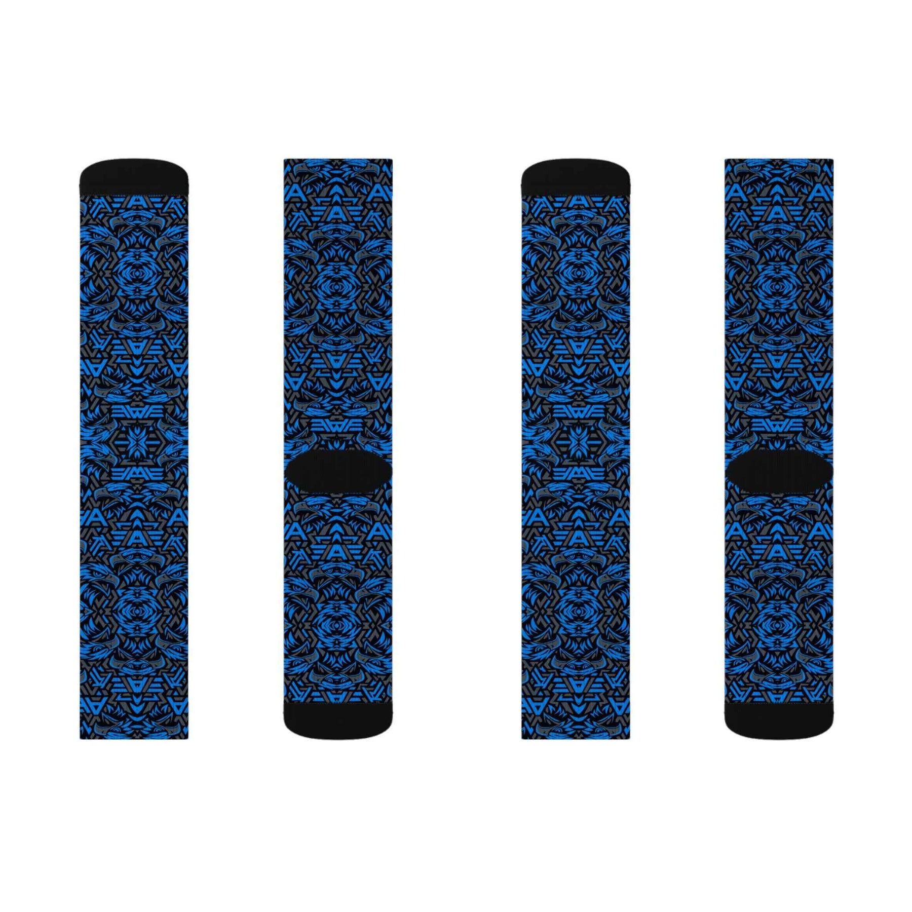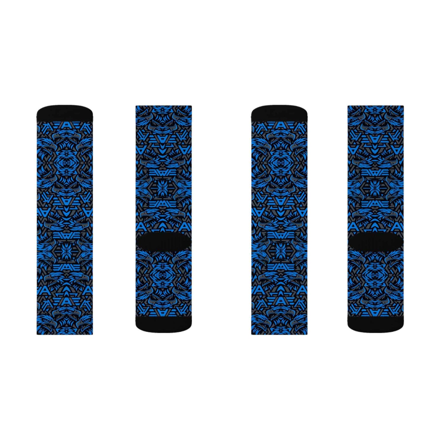 Slip into socks that feel like a quiet evening wrapped in texture. These Cyber Alpha crew-length sublimation socks bring a deep blue, geometric pattern all the way around your calf—rich, slightly tribal lines that read bold without shouting. Inside, a plush fleece lining meets cushioned bottoms so each step feels soft and steady. The ribbed tube holds the sock up without squeezing, and the stretch blend ensures a snug, comfortable fit across three sizes. Wear them with boots for long walks, under cozy loungewear for slow mornings, or as an unexpected pop of pattern when you want to lift a simple outfit. The subtly visible side seams are part of the printed construction—each pair has its own small variations, which only adds to their handmade-feel charm.