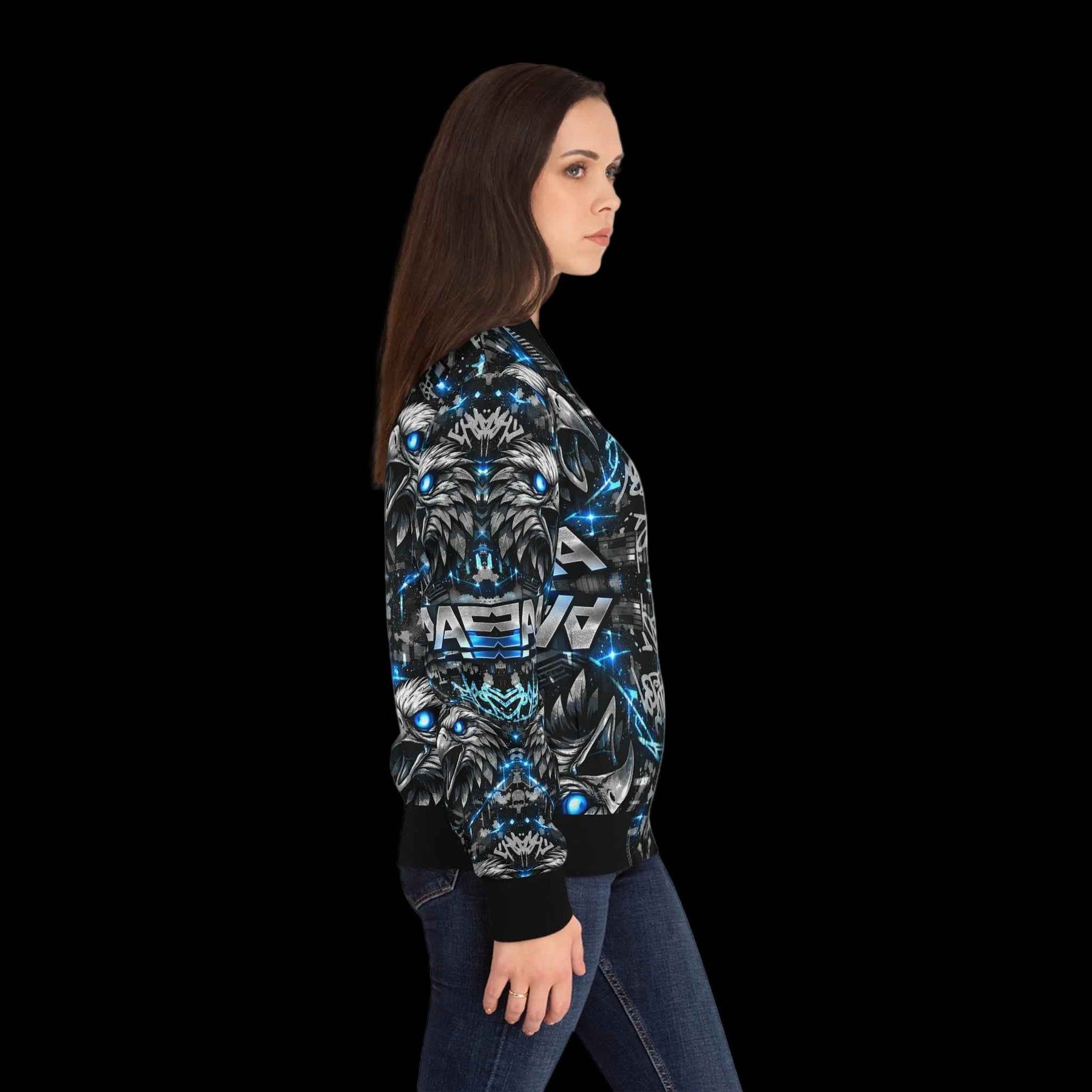 This bomber jacket brings urban edge and late-night energy to your everyday wardrobe. A bold, all-over print wraps the jacket in mirrored graphic eagles, electric blue accents, and layered typographic textures that read like street tags lit by neon. The low-profile stand collar, ribbed cuffs and hem, and front pockets keep the silhouette classic and wearable, while the copper zipper and black lining add contrast and attitude. Wear it on evening rides through the city, to underground shows, or whenever you want an outfit with attitude and motion. The lightweight polyester feels smooth against the skin and dries fast, so it layers easily over tees or hoodies without weighing you down.