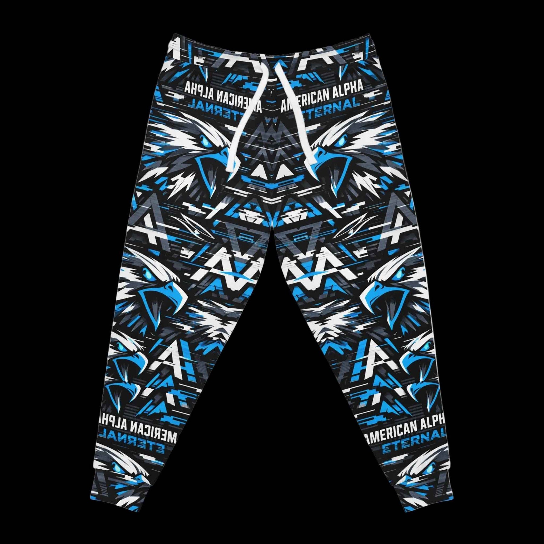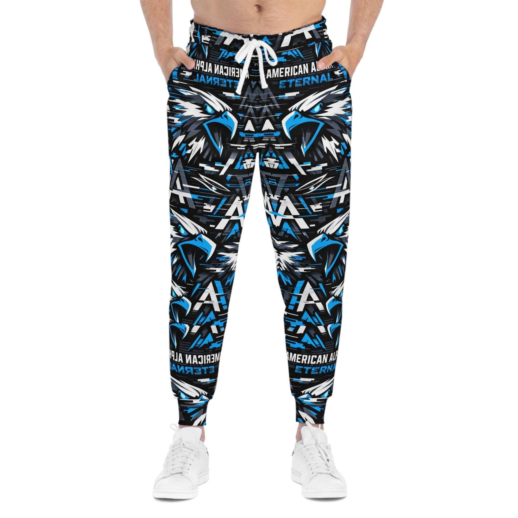 Slide into something that moves with you and makes a statement. These Glitch Alpha Limited Print joggers bring bold street-energy to warmups, late-night runs, or lazy weekends. The all-over graphic wraps sharp chevrons, a fierce hawk motif and layered “A” marks in electric blues and deep blacks — it reads like motion on fabric. The fit is relaxed but tapered at the ankle, the drawstring waist lets you lock in comfort, and deep double-layer side pockets carry your essentials without sagging. Wear them to practice, to the game, or to the studio and let the design do the talking; they feel soft against the skin and keep their shape through activity.