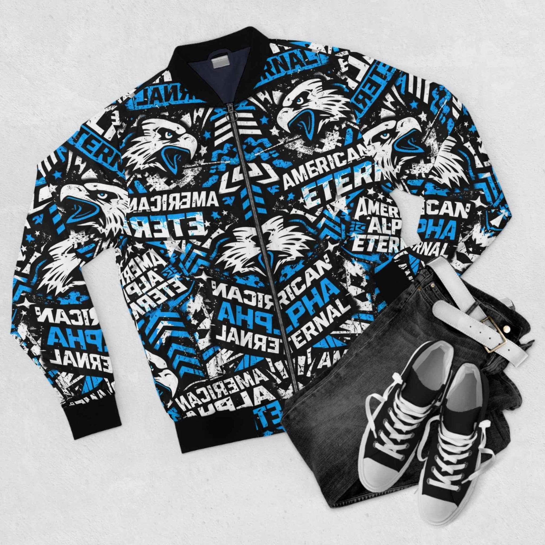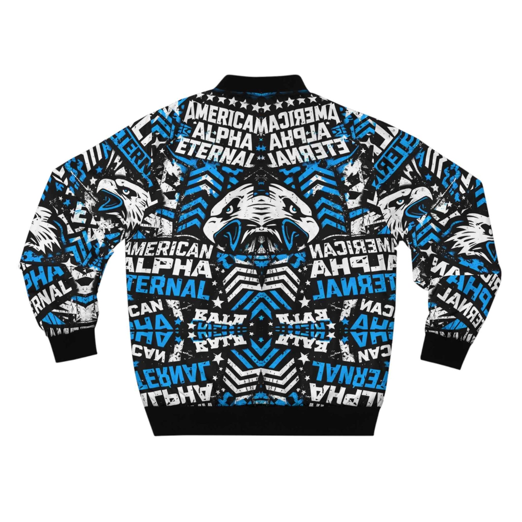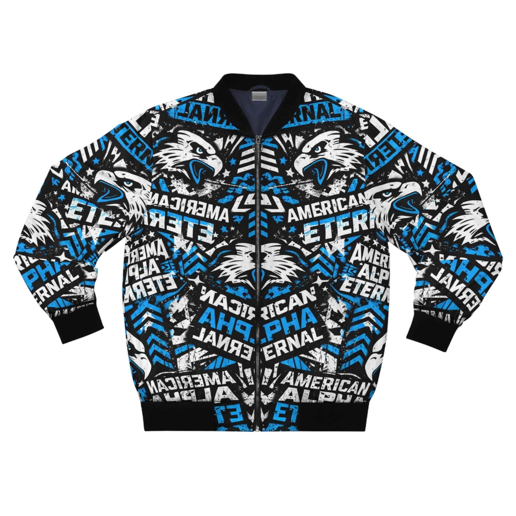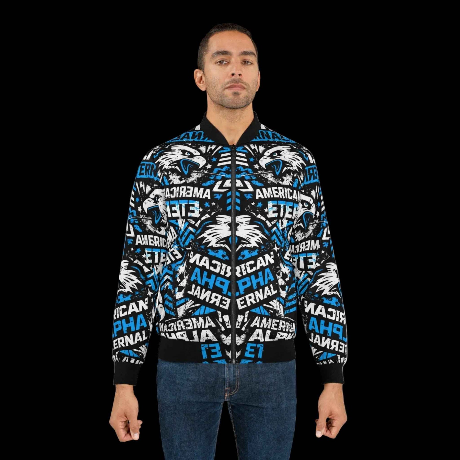 This bold bomber jacket wraps you in high-energy street style. The all-over print blends snarling wolf motifs with layered typography — “American,” “Alpha,” and “Eternal” — in electric blue, white, and black for a look that’s fierce and uncompromising. The sturdy polyester body and dark blue lining hold shape through wind and wear, while rib-knit cuffs, collar, and hem lock in warmth and add classic bomber proportions. Slanted front pockets and a full metal zipper give functional utility; the repeated graphics create motion and attitude whether you’re heading to a game, a late-night meet, or a weekend cruise through the city. This jacket reads like a statement piece: loud but wearable, engineered to keep its edge season after season.