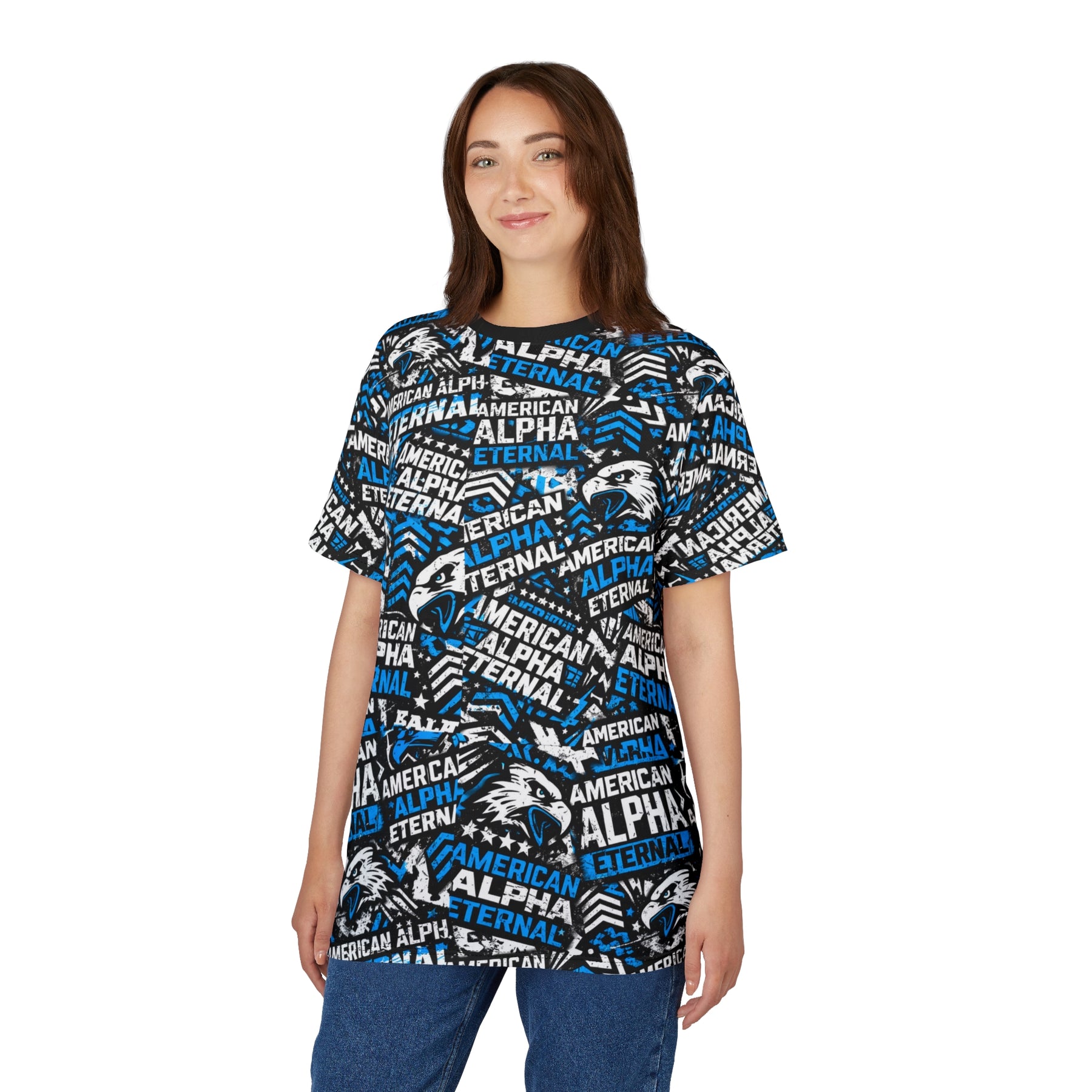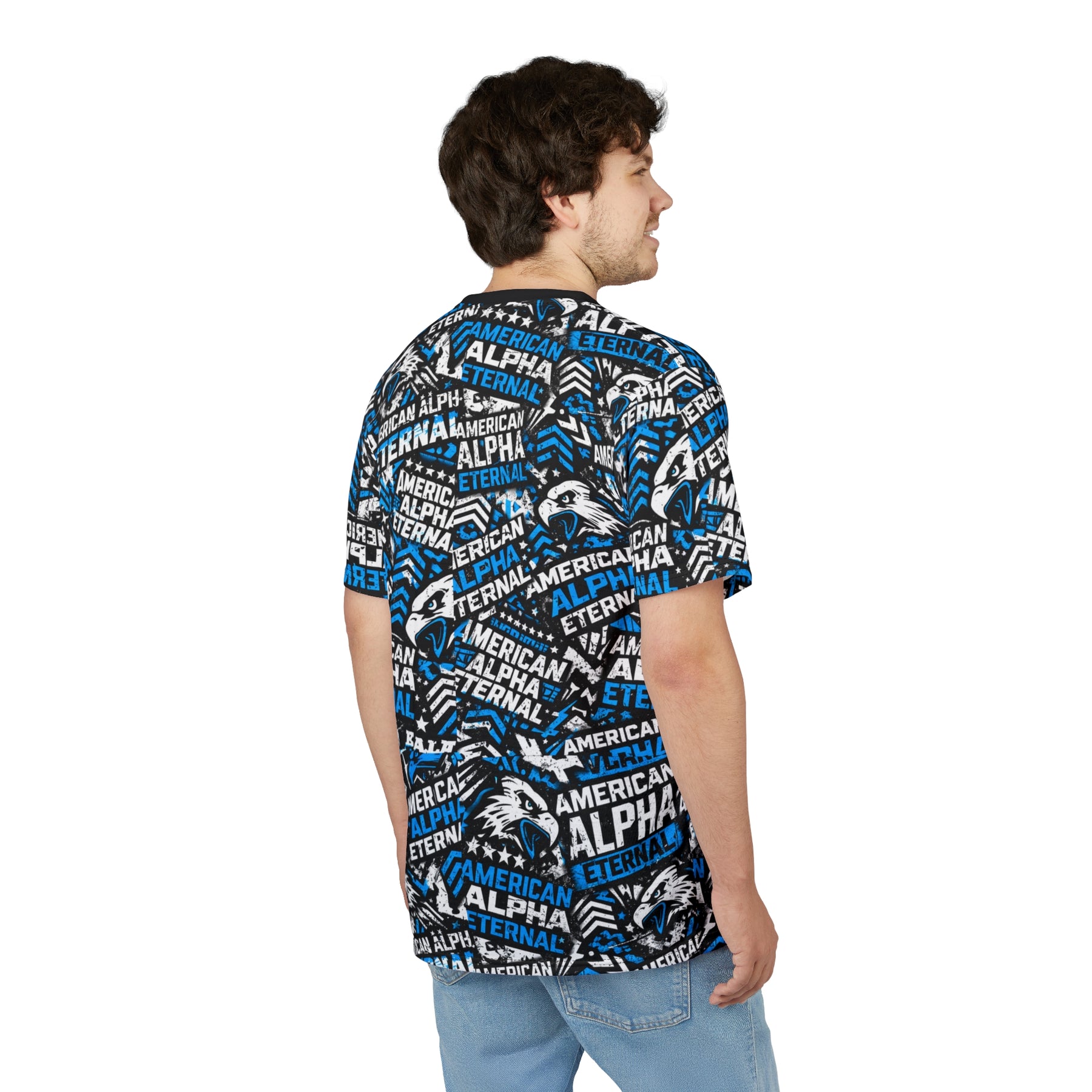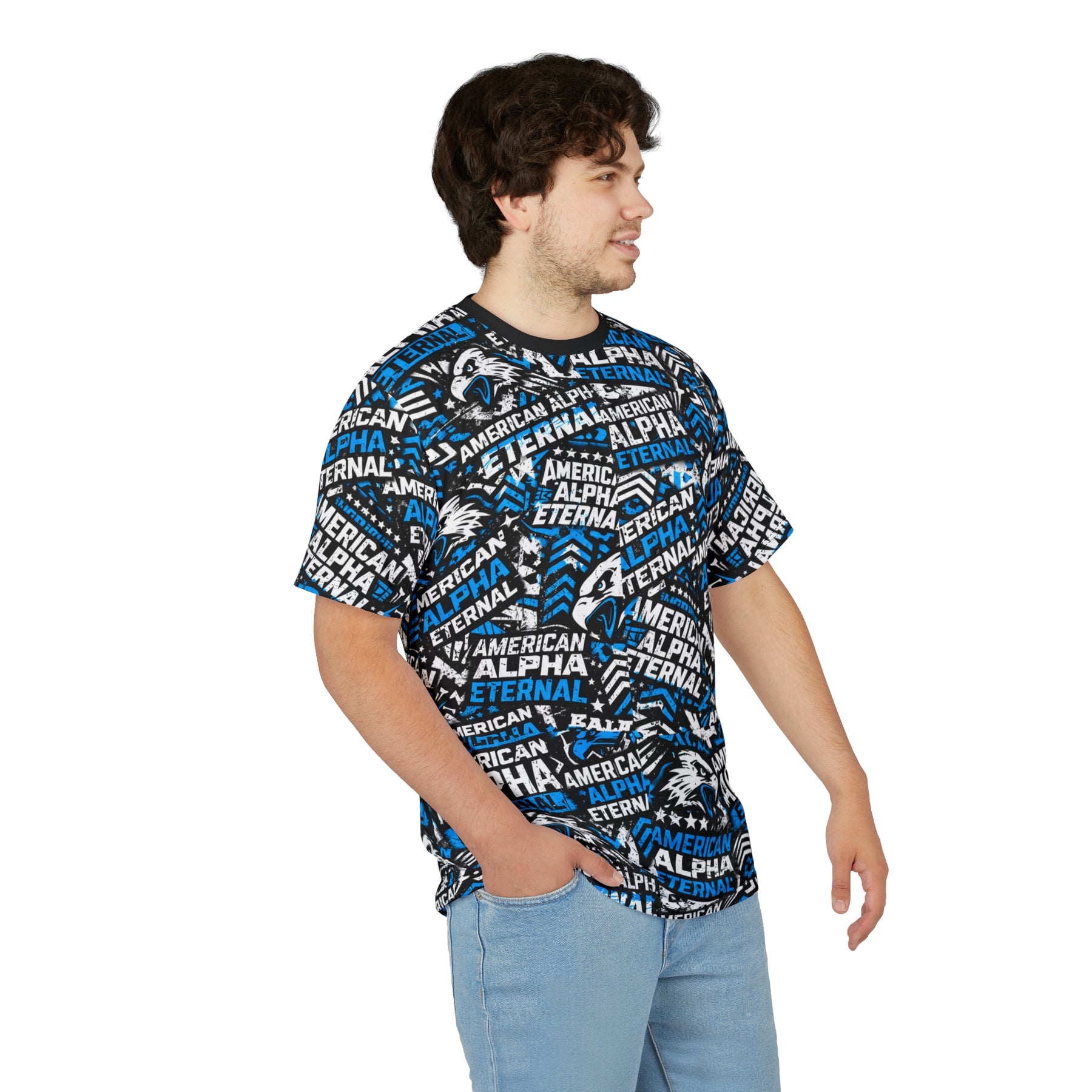 This Urban Collage tee carries a bold, energetic vibe — dense type work and a sharp eagle motif layered in blue, black, and white. Lightweight yet durable polyester keeps the colors vivid and the print seamless from sleeve to hem. Wear it to game days, team practices, or whenever you want to rep a spirited, athletic look that stands out. The regular fit and tagless design make it comfortable for long wear; ribbed collar and shoulder tape hold the shape so the graphic stays aligned and crisp wash after wash. Slip it on with jeans or a track short and let the loud, proud pattern do the talking.