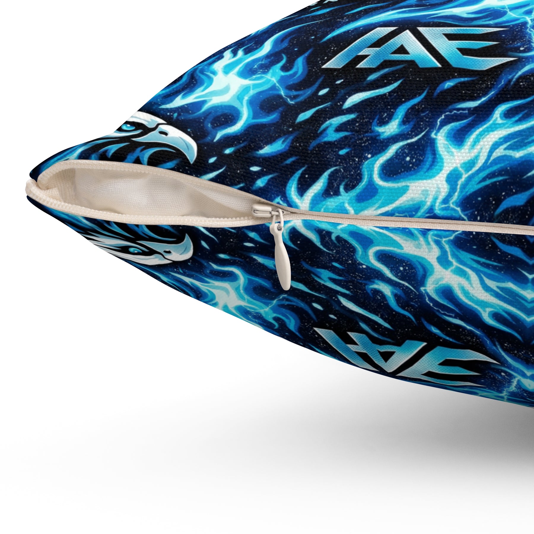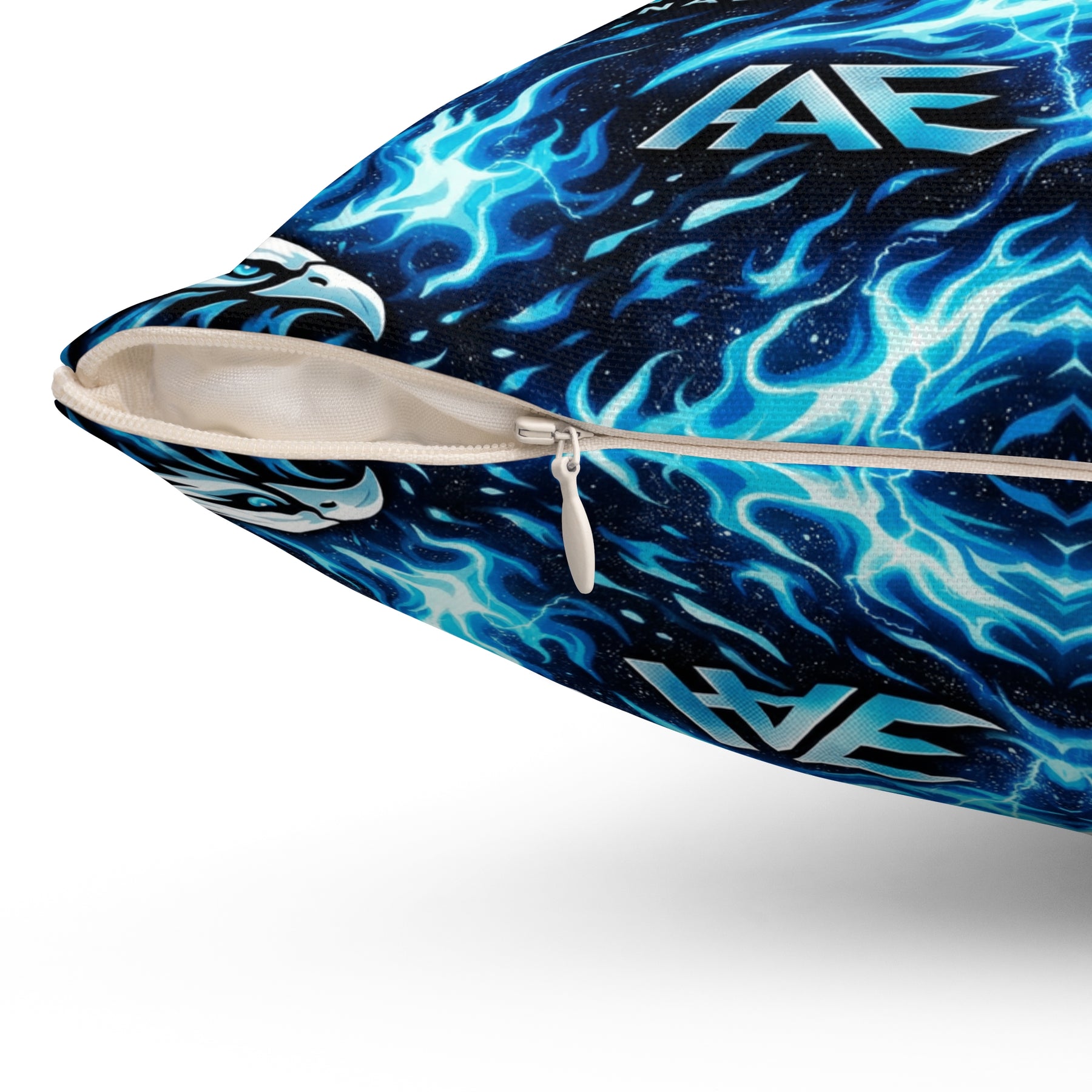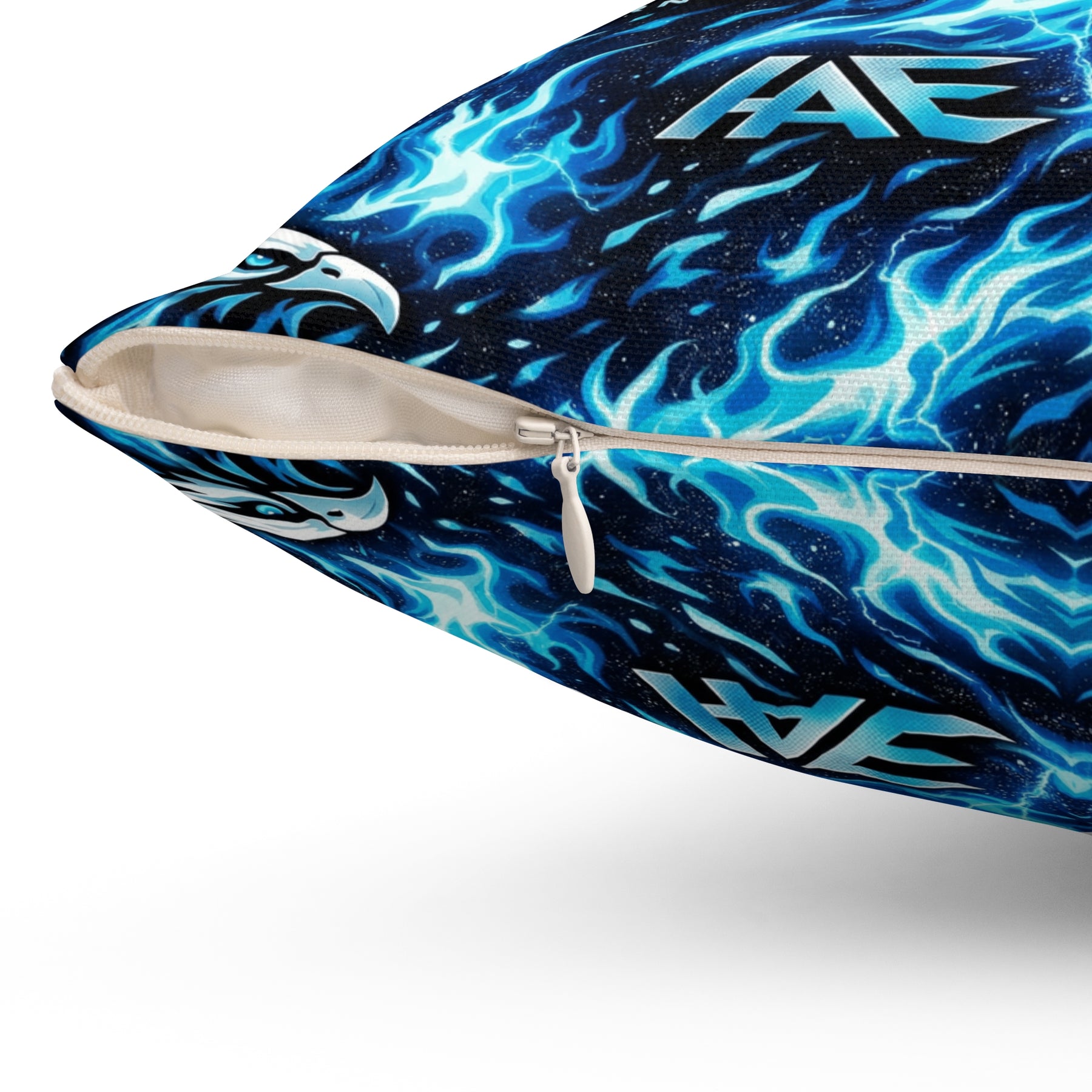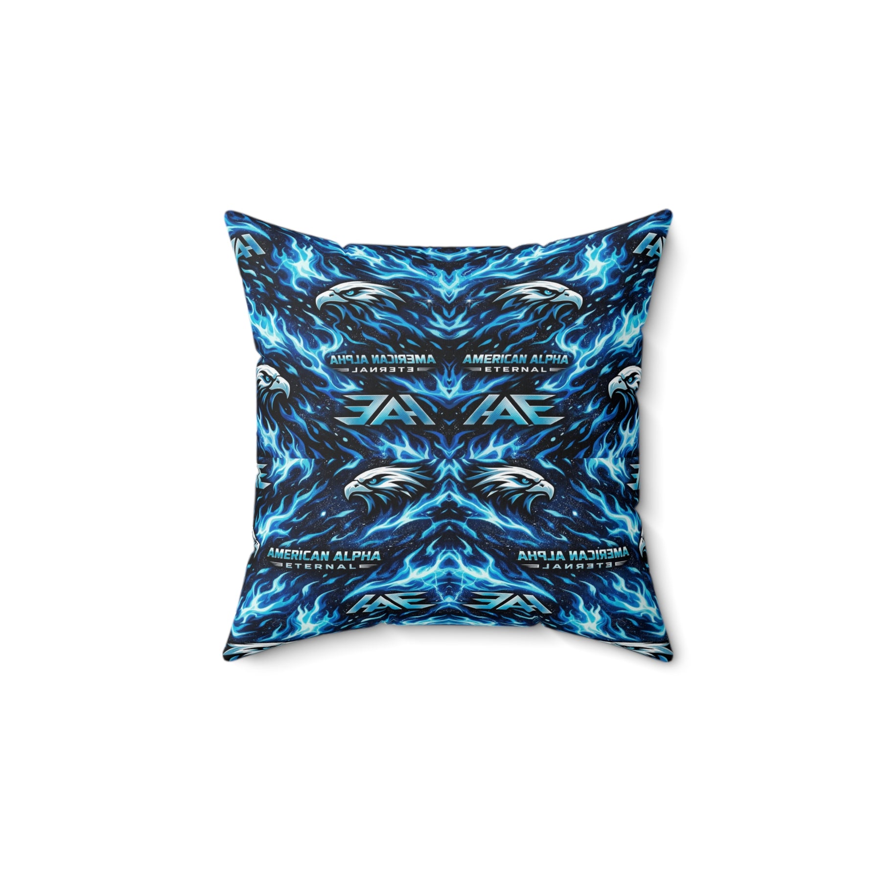 A bold, double-sided throw pillow that brings electric energy to any room. Vivid blues and inky blacks form a mirrored, kaleidoscopic pattern that feels like living light—sharp, dynamic, and a little wild. The cover’s spun polyester holds crisp color and shape without wrinkling, while the recycled polyester insert ships compressed so you can fluff it to full, pillowy volume. Tuck it on a couch or a reading nook to lift the mood and anchor modern, music-driven, or gamer-forward decor with a striking visual pulse.