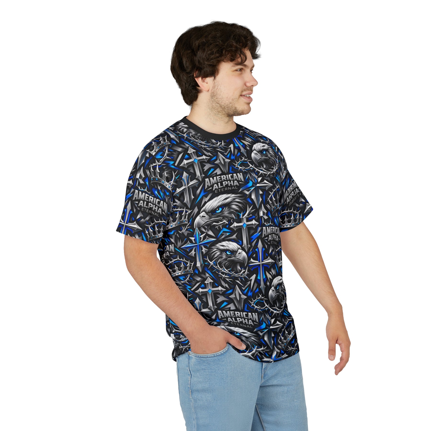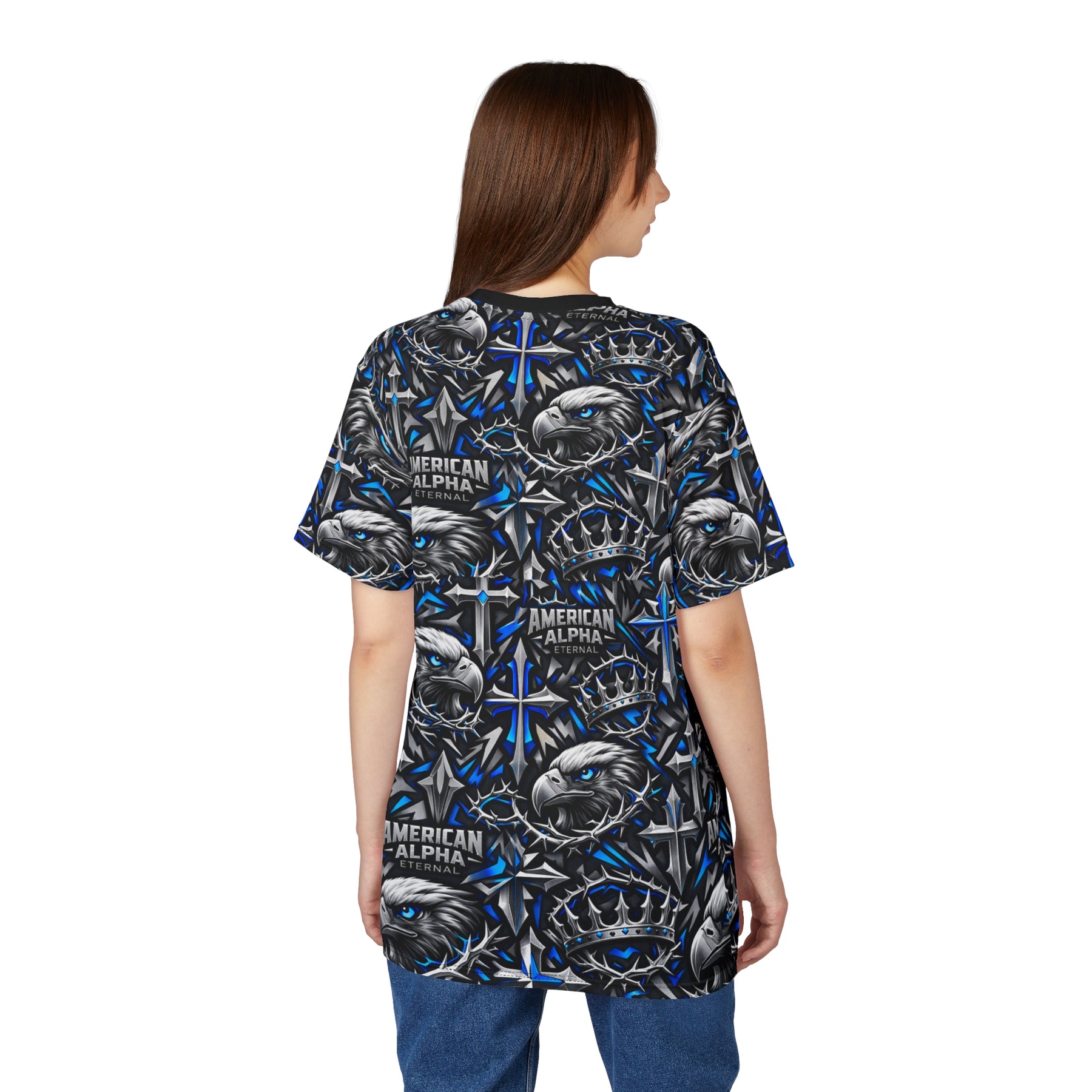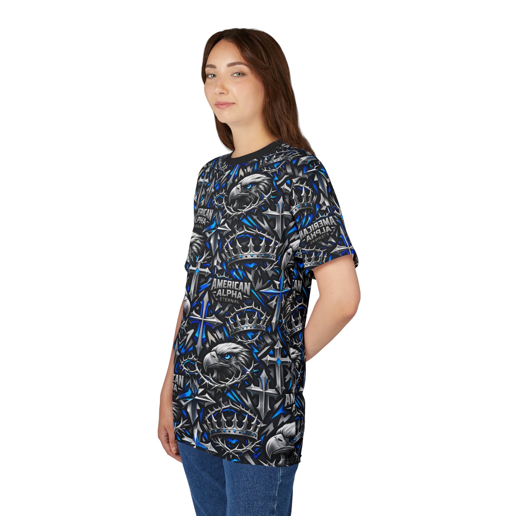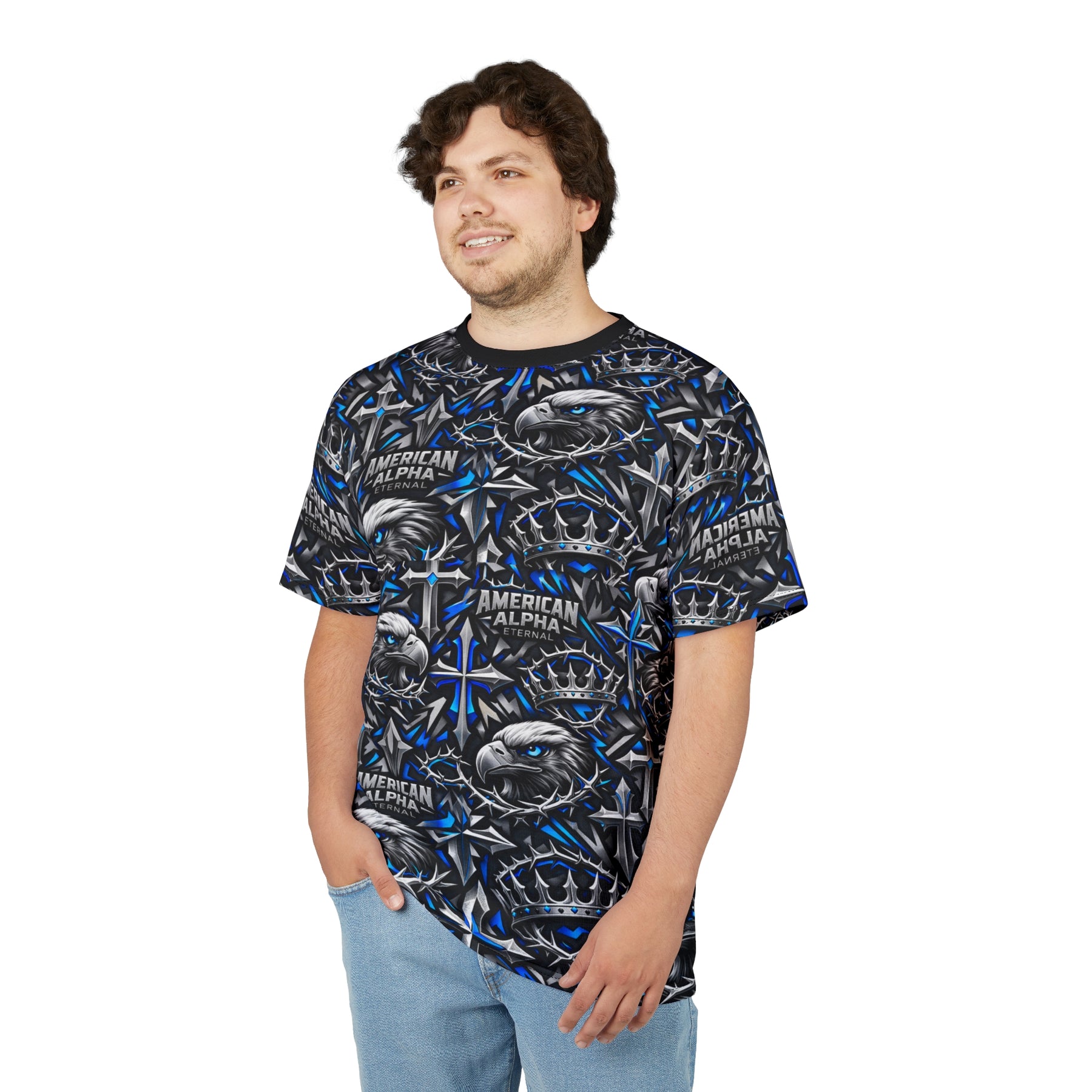 A bold all-over print tee that mixes heraldic strength with modern edge. Crowns and crosses sit together in a repeating pattern, speaking to lineage, resilience, and quiet confidence. The lightweight polyester keeps the print vivid and the shirt feeling breathable during long days. Wear it layered under a work jacket or as the focal piece at a weekend meet-up — it reads like a statement from someone who respects tradition but lives in the now.