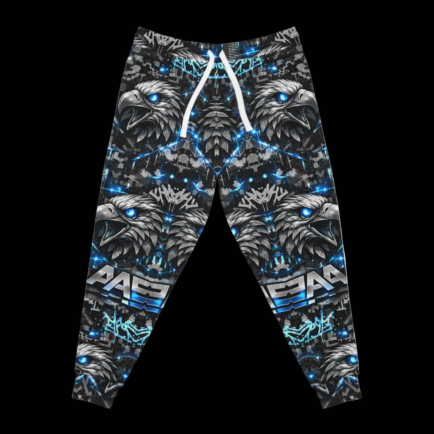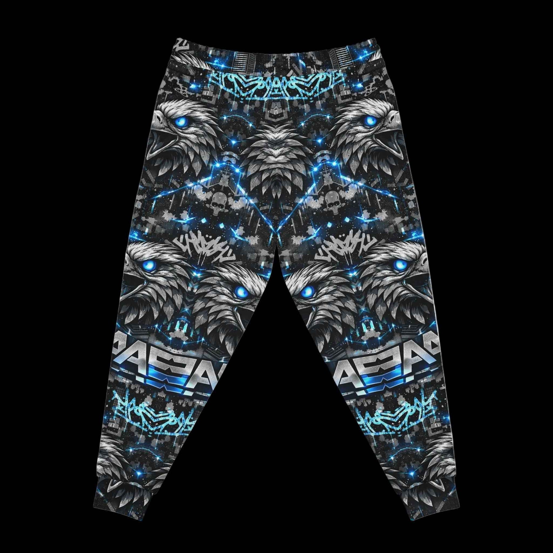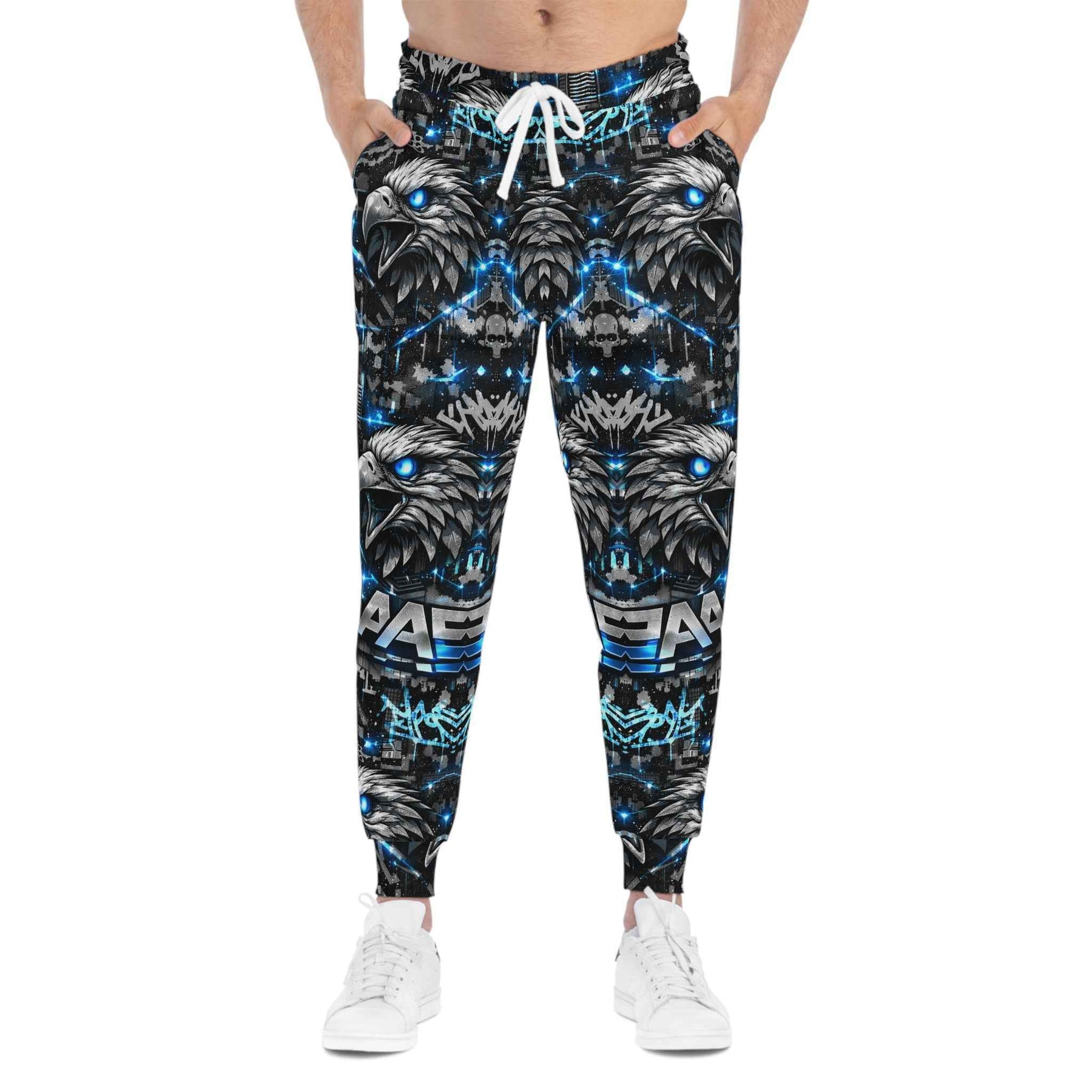 Slide into these bold Cyber Alpha Eternal athletic joggers and let the city-night energy follow you. The all-over print wraps a layered, streetwise eagle motif in electric cyan and ink-black; it reads like graffiti armor when you move. The fabric is soft and springy, so steps feel light whether you’re pacing the block, sketching through a late-night session, or layering up for a weekend skate run. Practical details—deep double-layer side pockets and a drawstring waist—keep essentials secure while the medium-weight knit keeps the silhouette structured without overheating. Wear them with a cropped hoodie or an oversized tee to let the pattern take center stage and bring an urban, charged attitude to hangouts, night markets, or creative meetups.