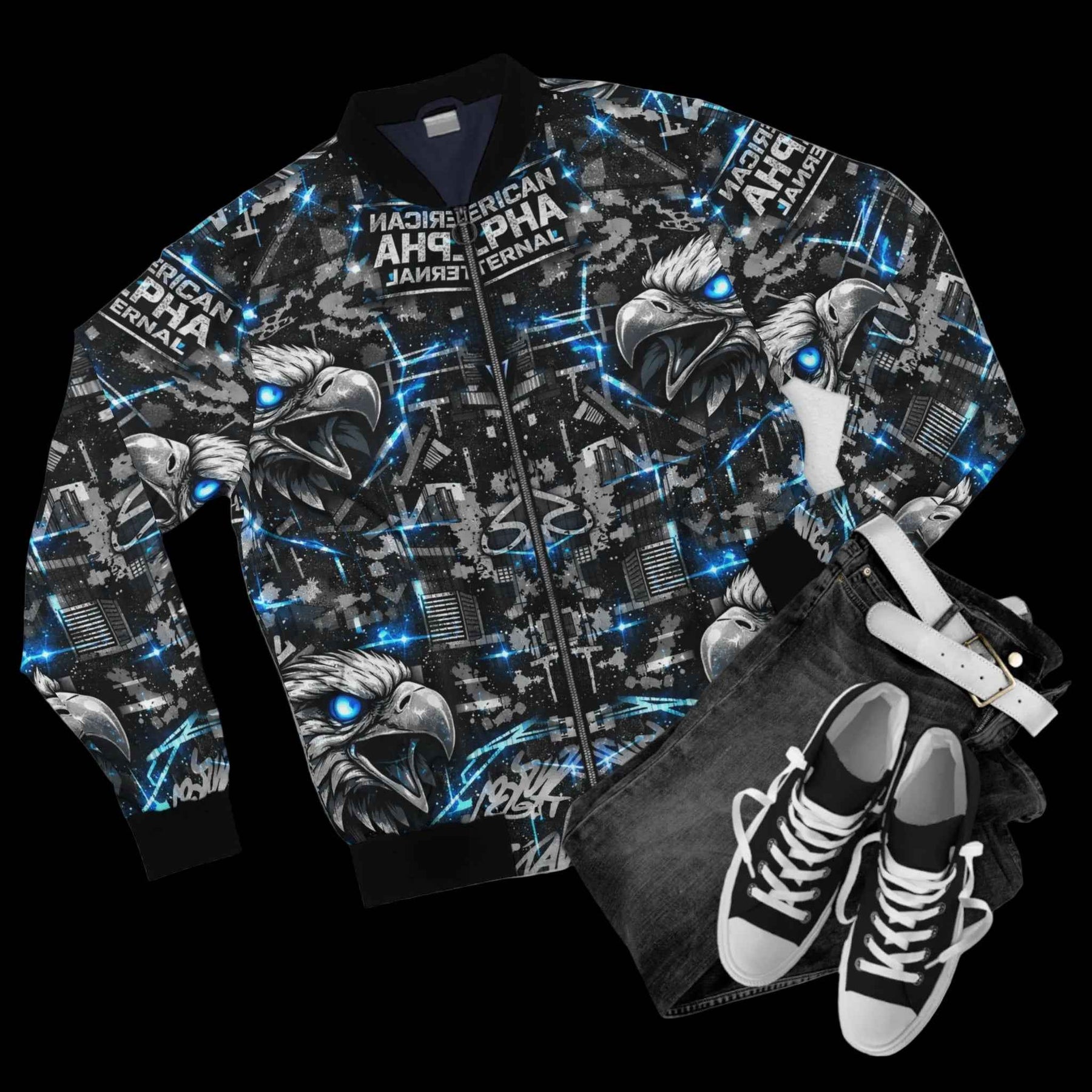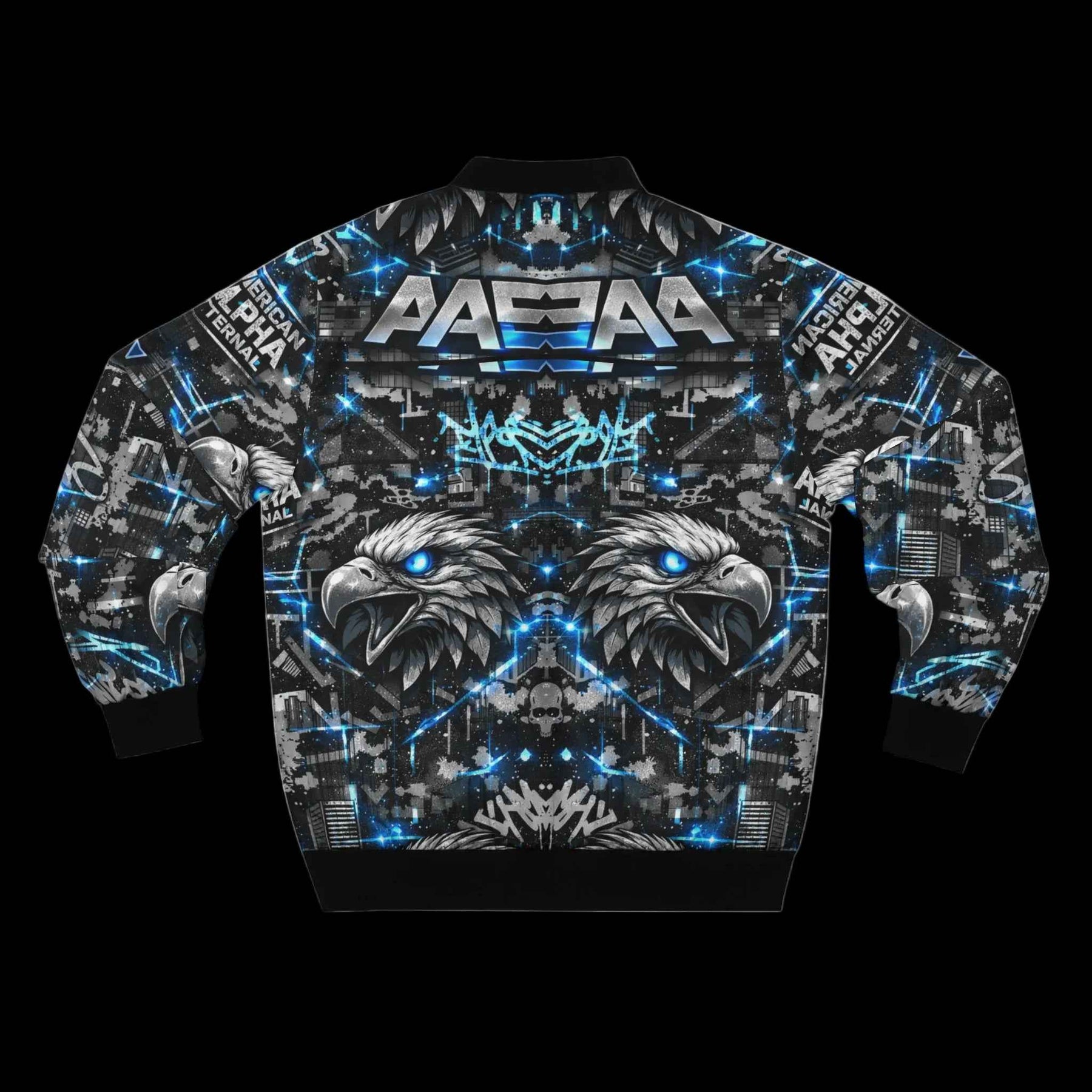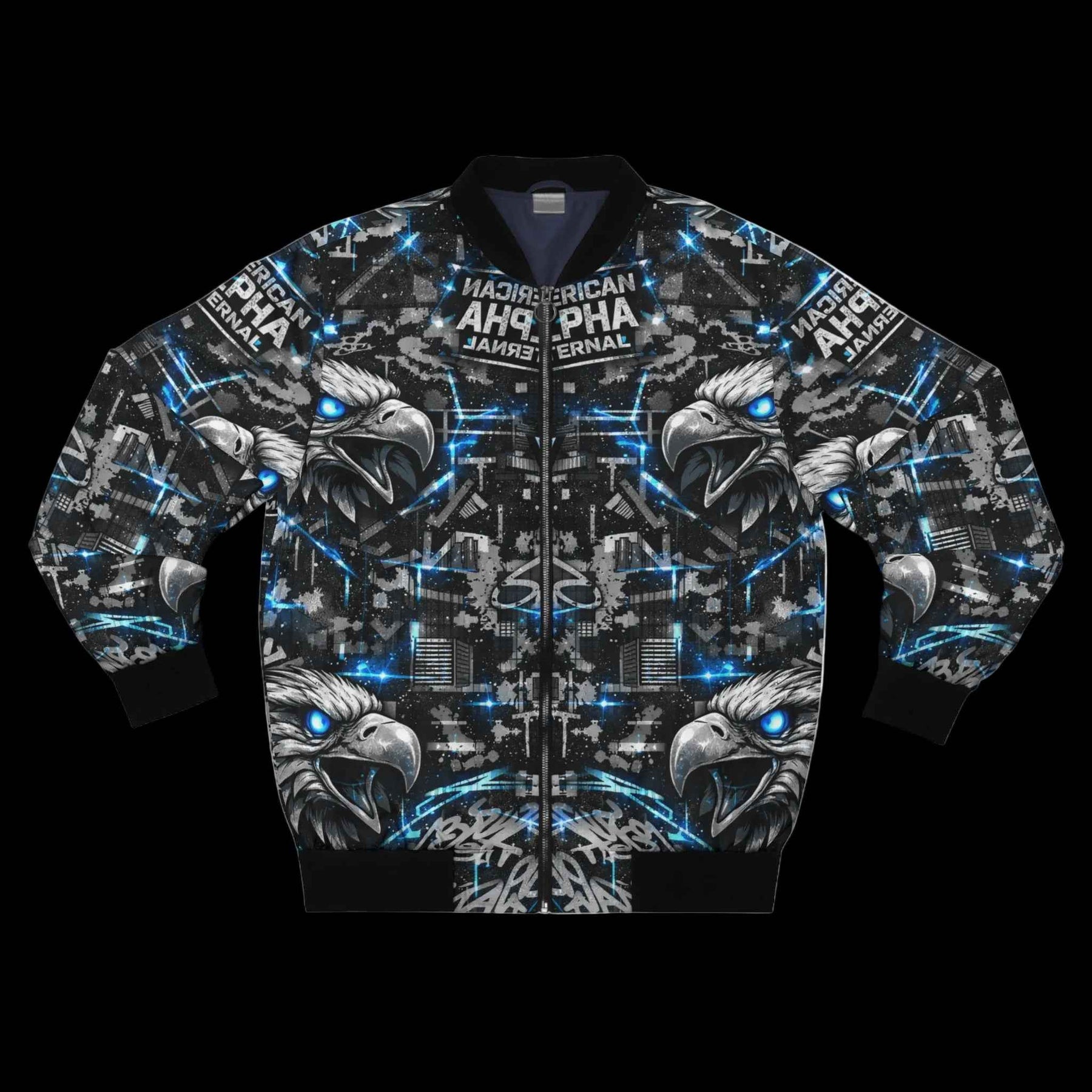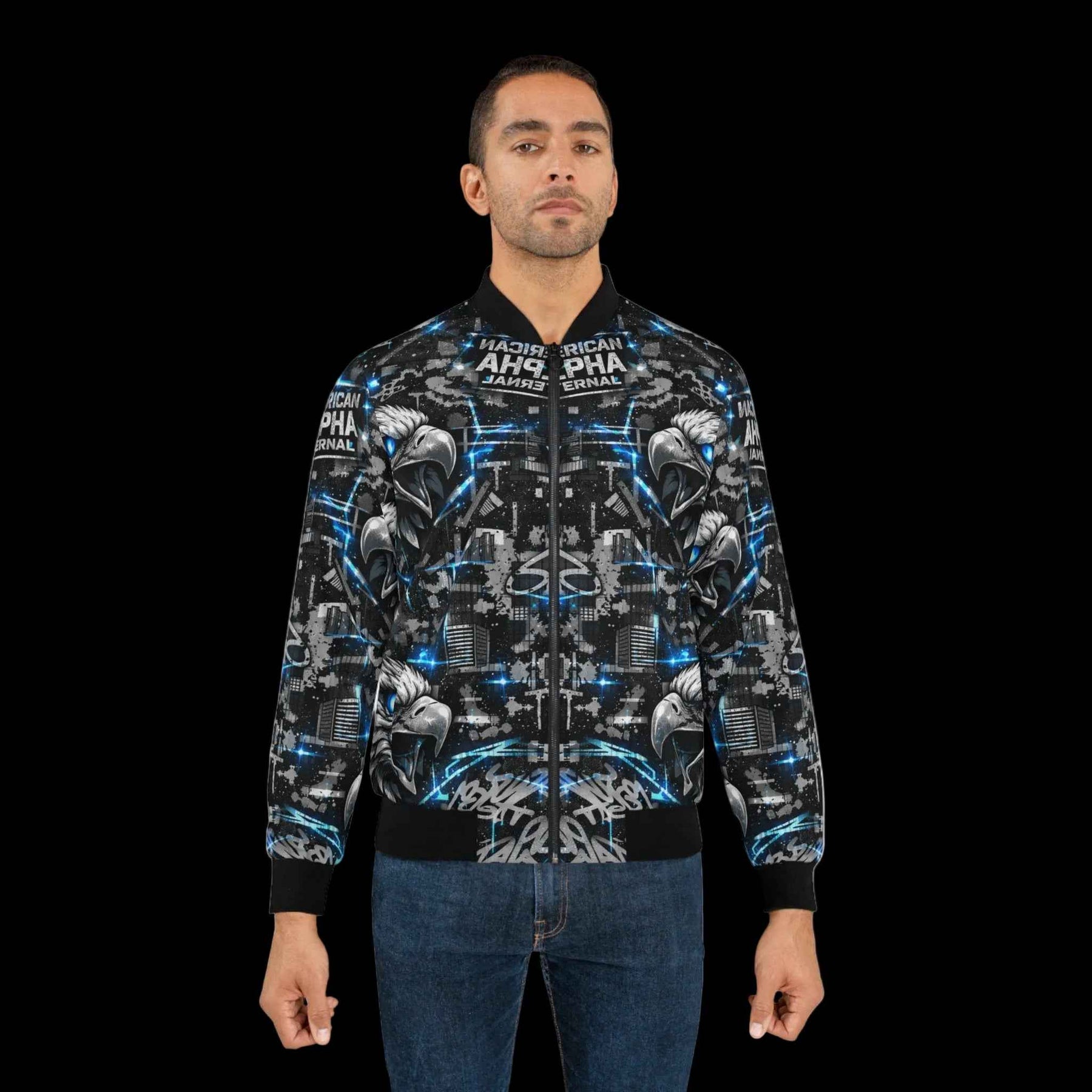 This bomber jacket wraps bold street energy into a wearable canvas. The all-over print layers mirrored eagle heads, electric blue accents, and urban textures for an aggressive, kinetic look — like a night skyline lit by neon and motion. The rib-knit collar and cuffs anchor the design with matte black contrast while a full metal zipper and lined pockets keep it functional on chilly walks or late-night meetups. Wear it when you want an outer layer that reads loud and confident: it moves with you through city streets, venue lines, and weekend rides, giving a tactile edge to your everyday rotation.