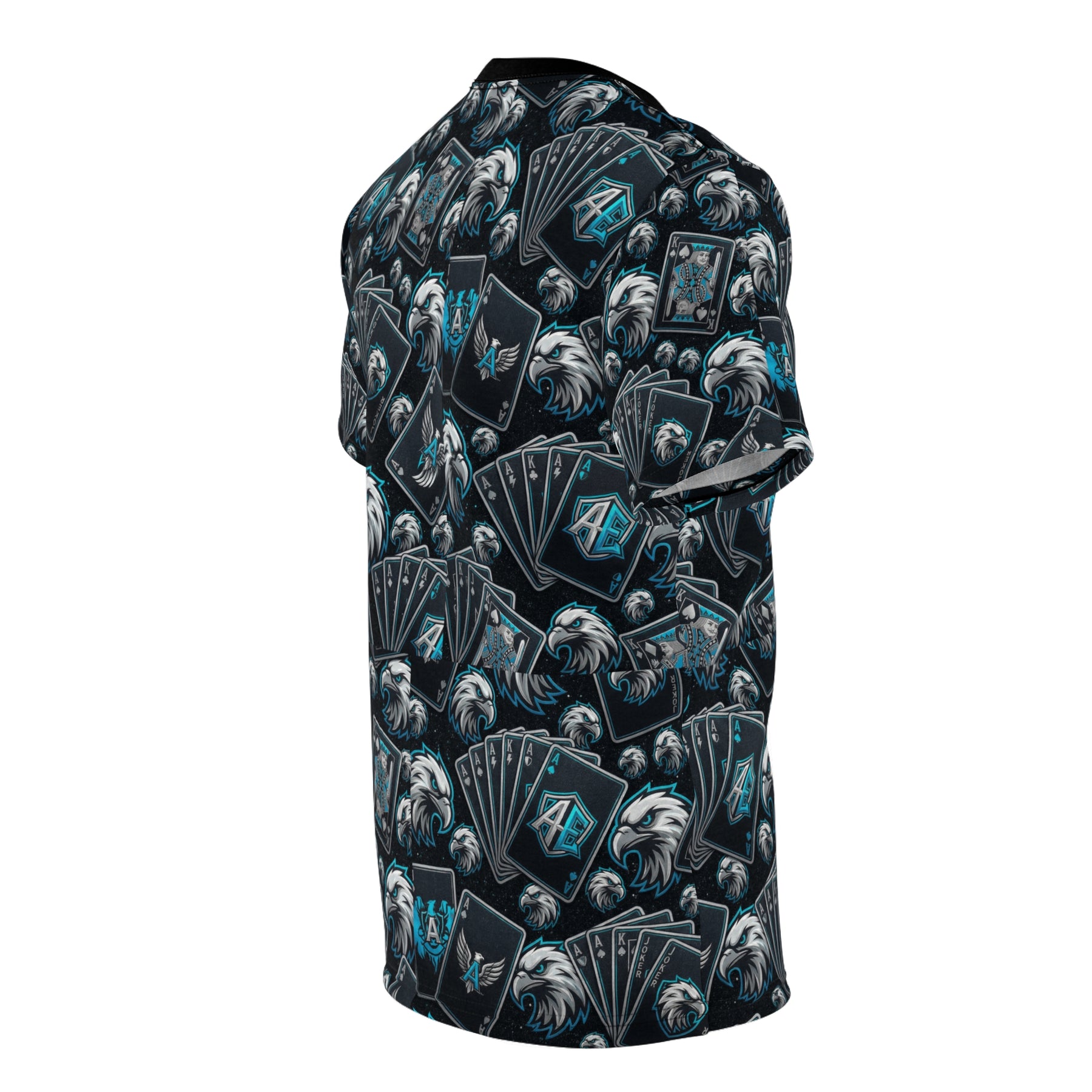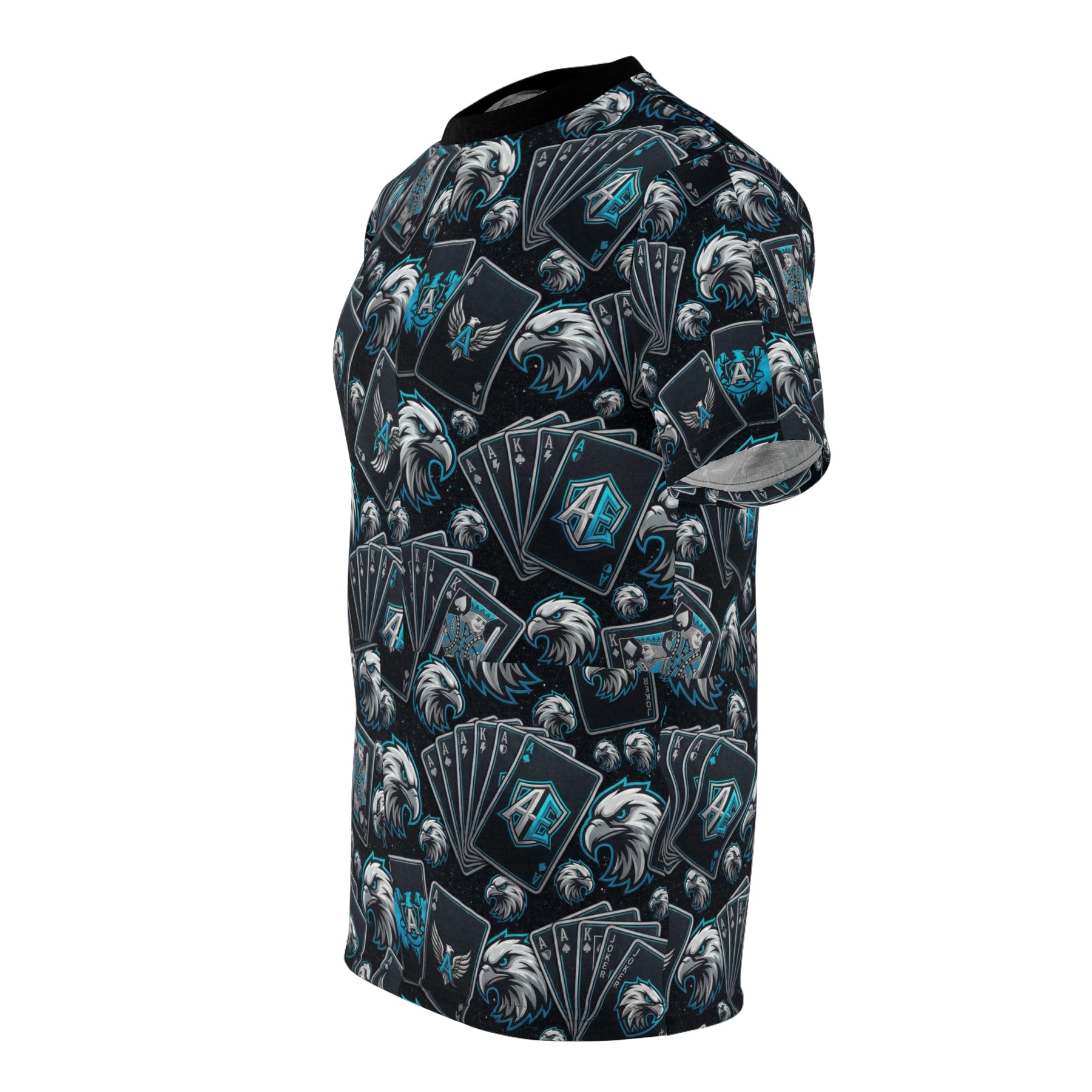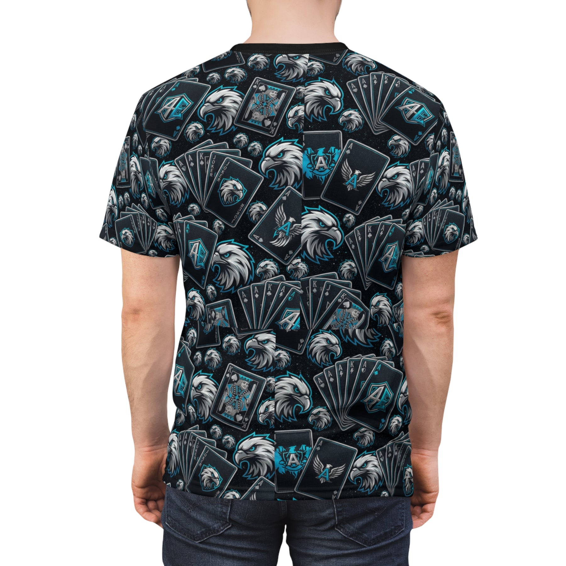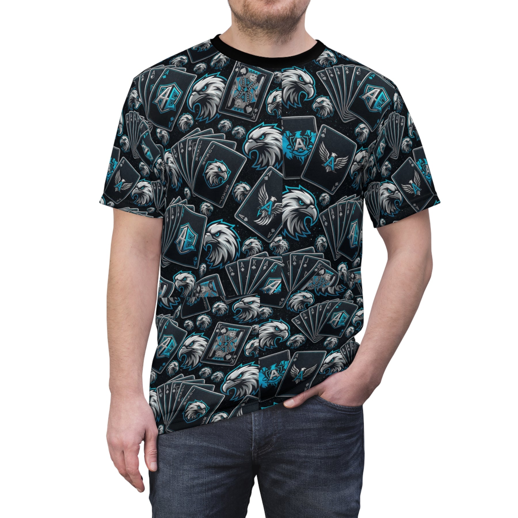 This all-over print tee brings deck-night energy to everyday wear. Dark, moody cards and a bold eagle motif repeat across a soft, durable polyester body—subtle enough for daily rotation, loud enough to start conversations at a game night. The ragged pile of fanned playing cards and the eagle crest suggest strategy, risk, and the thrill of a winning hand. Wear it to casual meetups, card tournaments, or late-night hangouts when you want a look that reads confident and a little rebellious. The slim, regular silhouette and black-ribbed collar keep the design clean while the full-coverage print makes the shirt feel like a single, wearable statement piece.