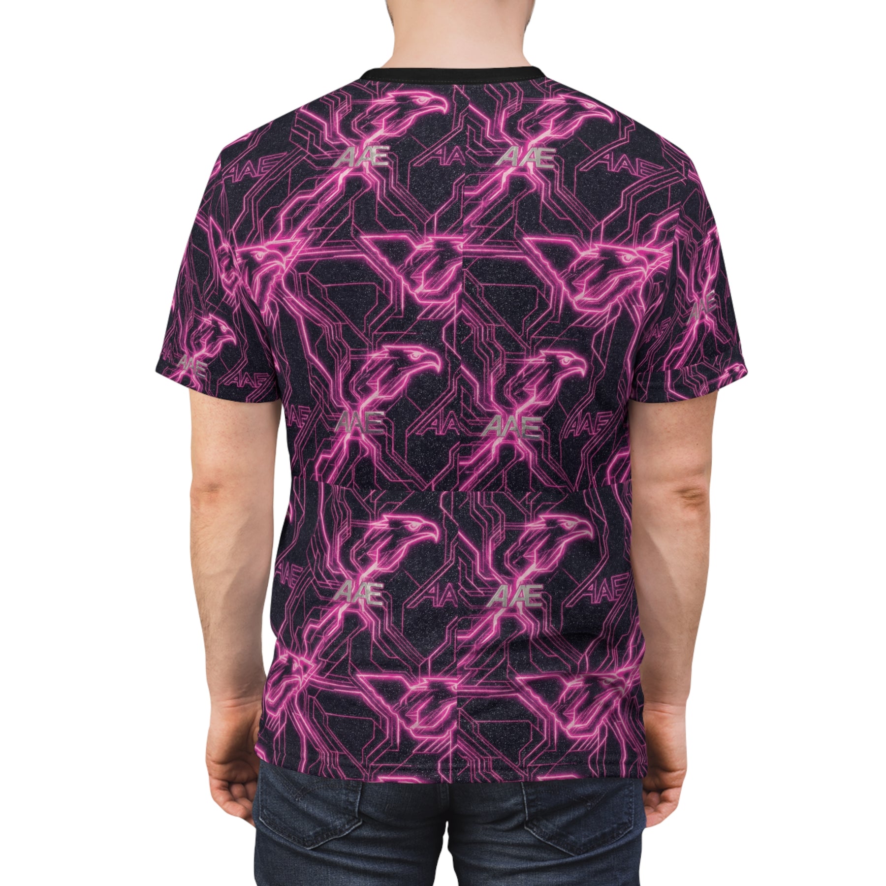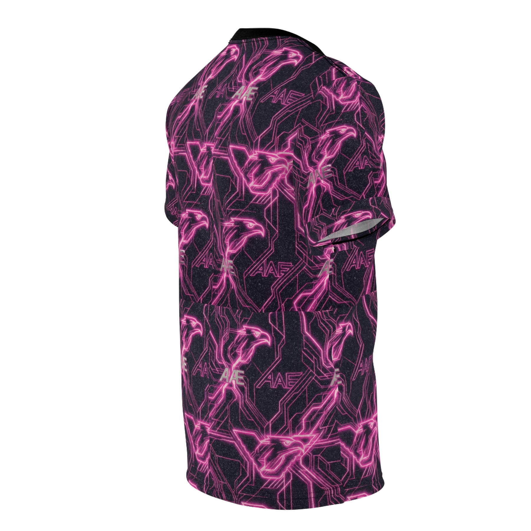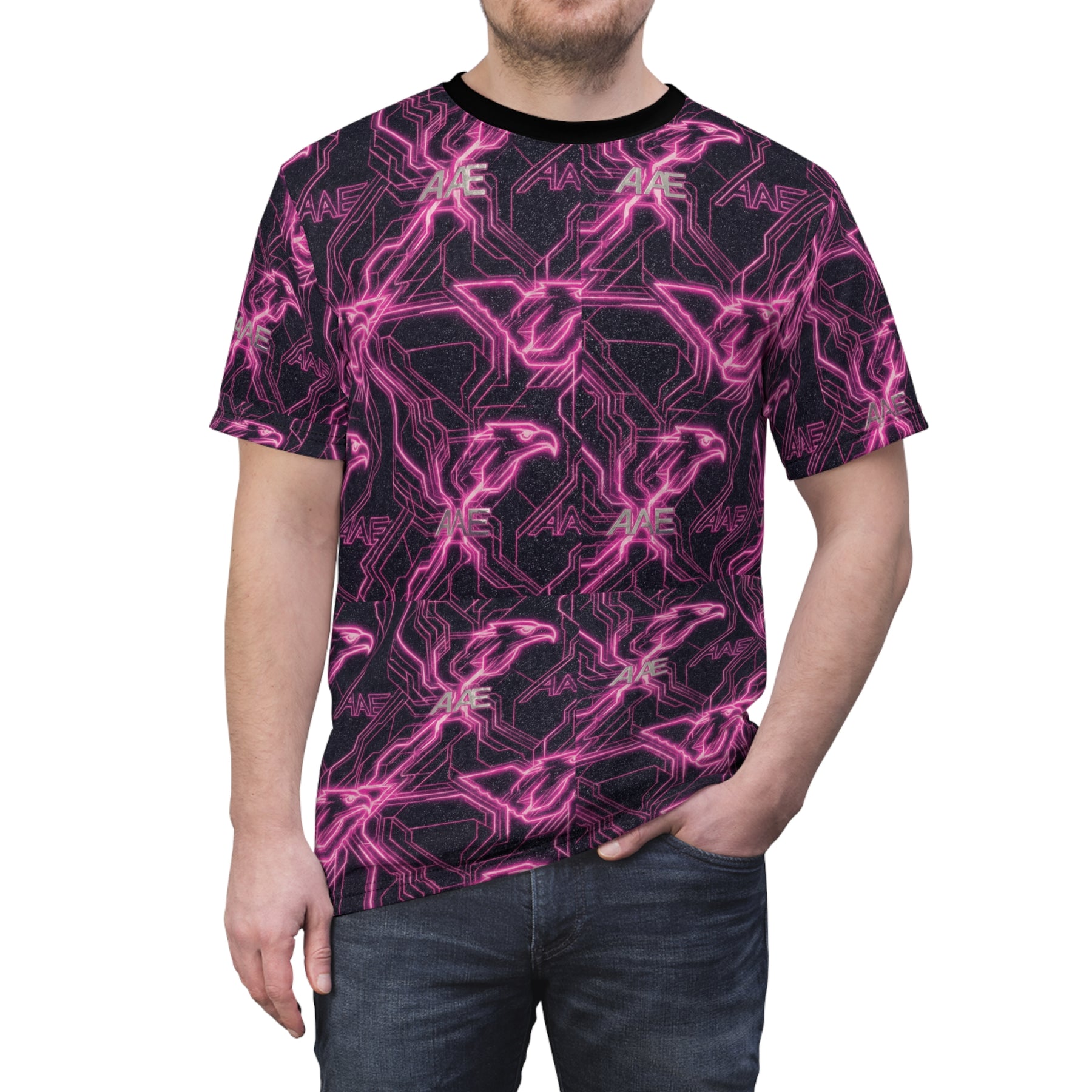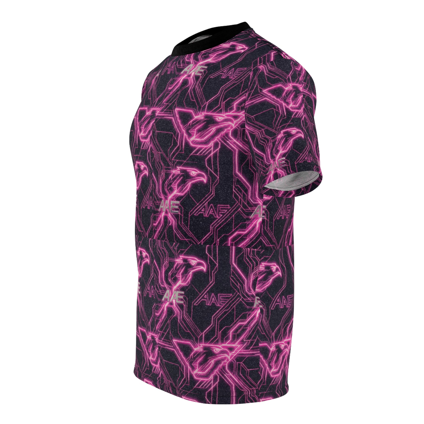 This tee hums with neon energy — an all-over print of pulsing pink fractal lines that curl into abstract eagle motifs against a deep, shadowed background. Lightweight and slightly glossy from the polyester, it keeps the design vibrant and moving whether you're walking city streets or hanging out at a late-night show. The ribbed collar and shoulder tape keep the silhouette sharp after many washes. Wear it when you want your look to feel electric, bold, and just a little bit mysterious.